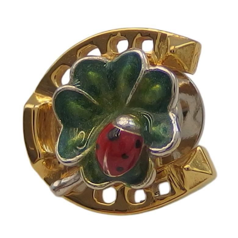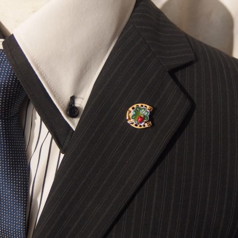 高級なイタリア製ラペルピン。馬蹄と四つ葉クローバーが幸運を呼び込む。華やかで個性的、スタイリッシュで抜群の質感。
